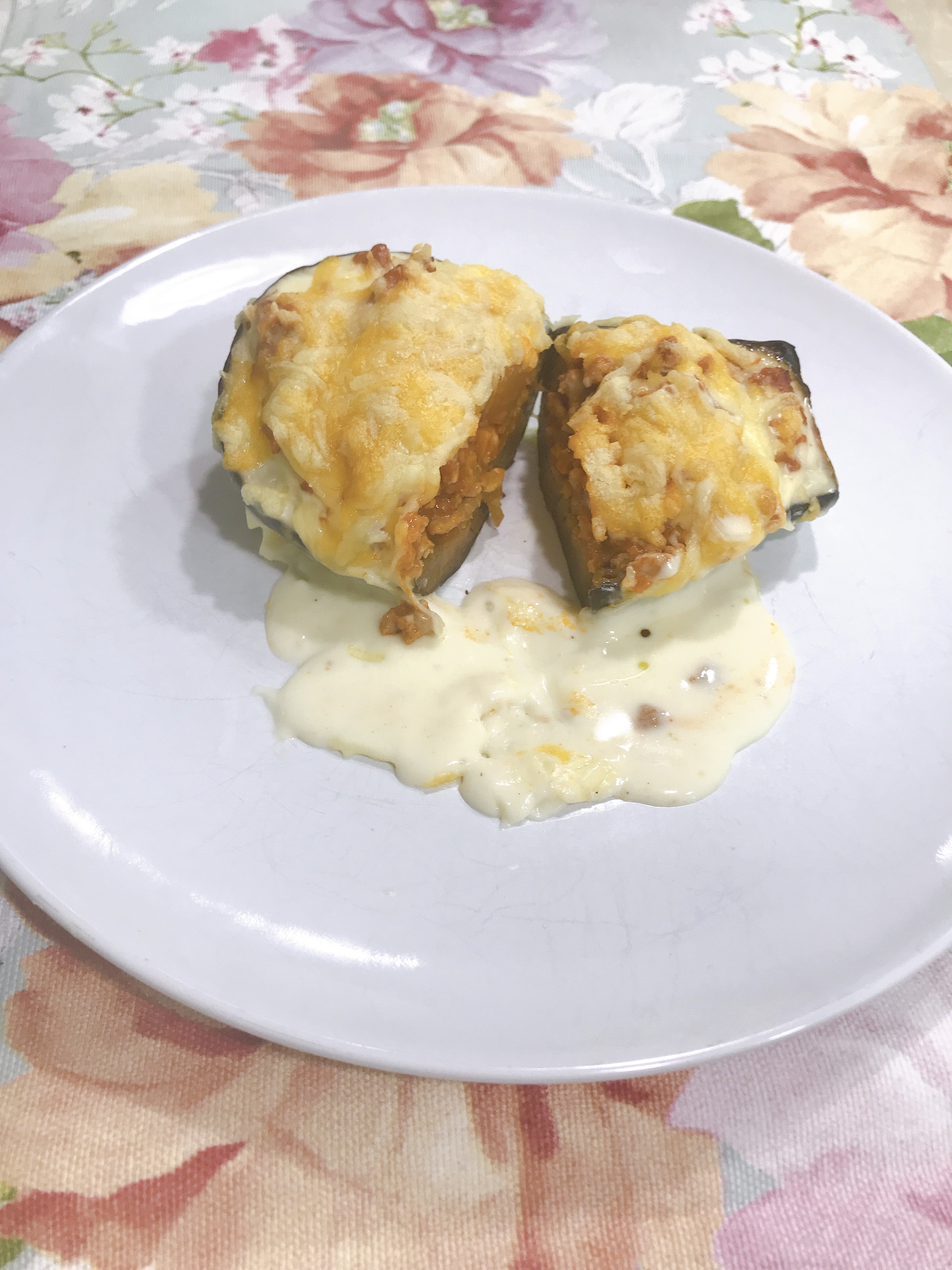 Rellenamos las berenjenas con la carne picada en la fuente del horno. Añadimos la bechamel por encima y el queso rallado. Metemos al horno de nuevo durante 15 minutos.